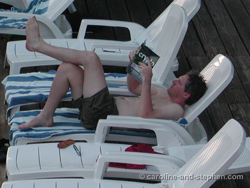 46 By the pool... is that a book on cryptography?! Some people have a funny ideas on what relaxing is! Harry Potter was Caroline's choice!