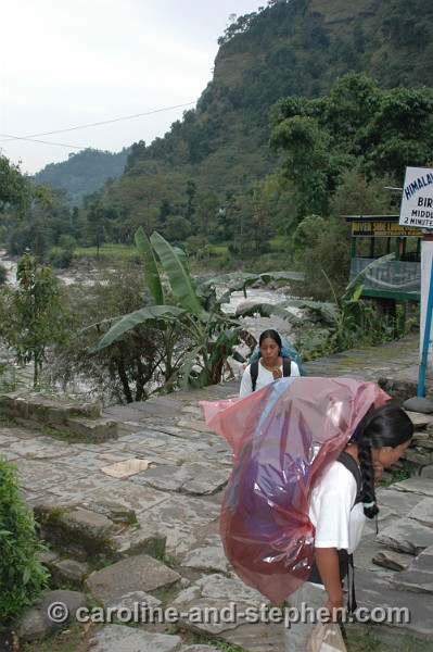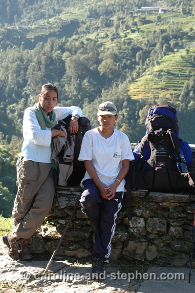 7 The trek has started. Our porters: Bima (back) and Dhana. Notice the plastic covers...