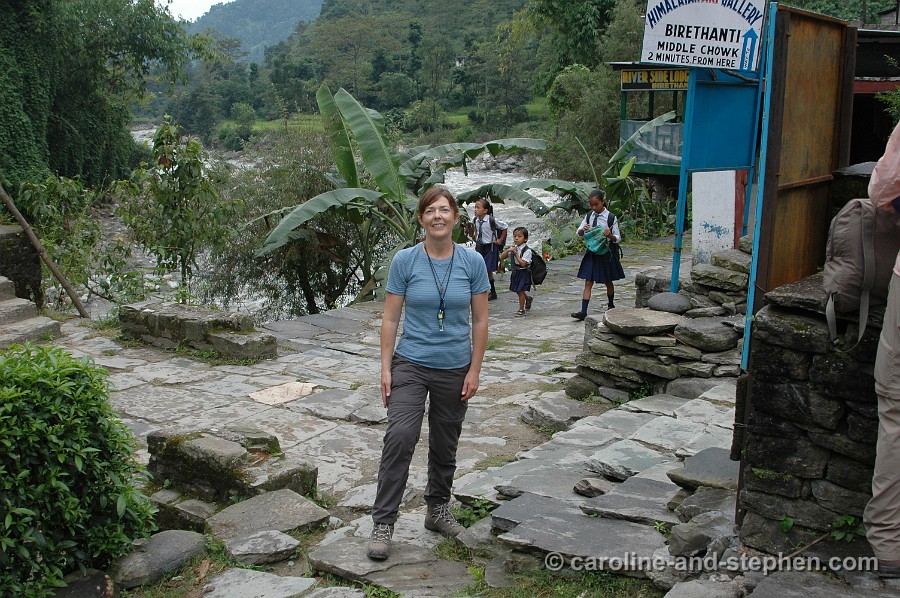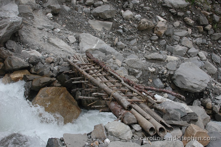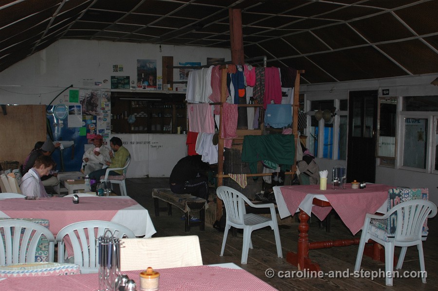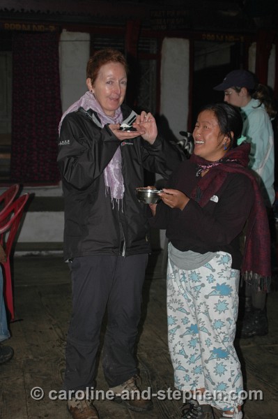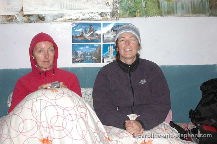 31 Day 6: This is only our tea break in the guesthouse house at Himalaya. We had just crossed an out-of-control mountain stream barefoot (which at least kept our shoes and socks dry).