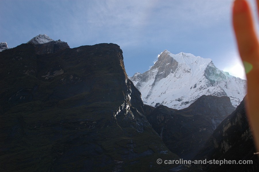 33 Day 7: first blue sky views of the Annapurna's. Yep, that's my finger trying to block the sun a little.
