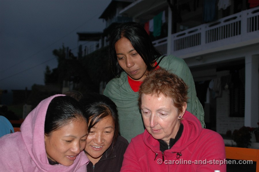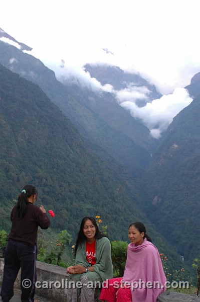 52 Day 9: view from 'International Guest House' in Chhomrong - with Nirma, Bima and Dhana.