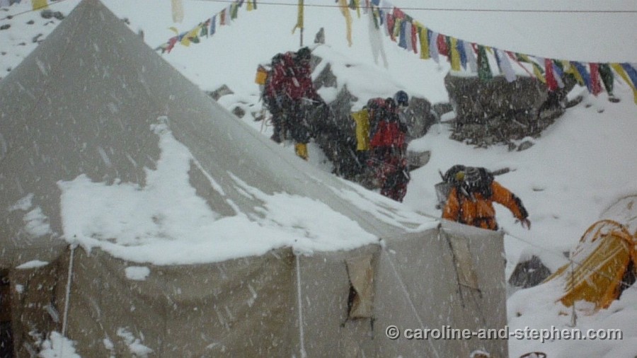 58Day 17. May 25, 12pm. Stephen walks back into EBC; he's the middle one of those 3. (The shaking is me trying to keep the snow off the camera; when I refer to 'orange' I mean the darker orange windsuit). (Check out the video!!! Desktop or iphone version)