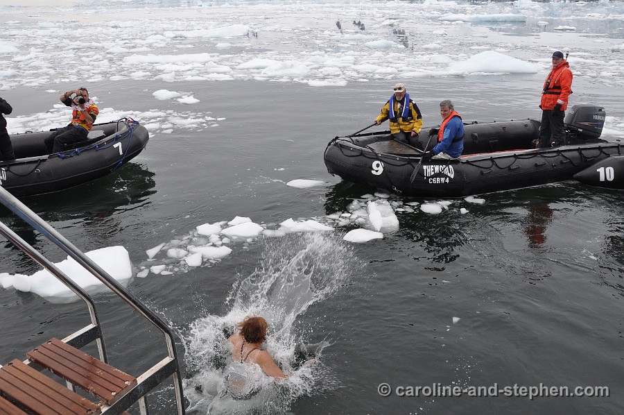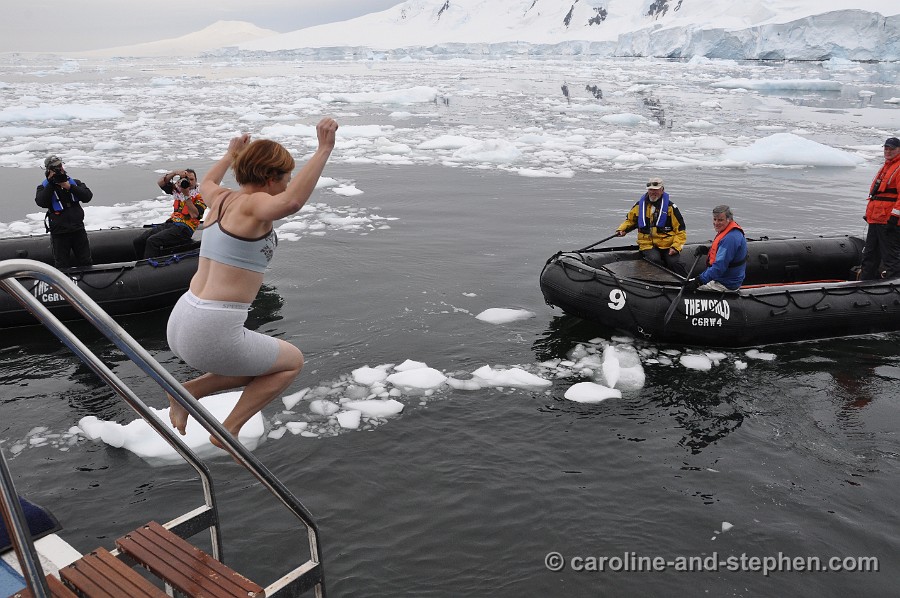 17Porcquoi Pas Island and Polar Plunge The Polar Plunge. Caroline taking a flying leap into water. Notice the brash ice in the water. It might be cold?