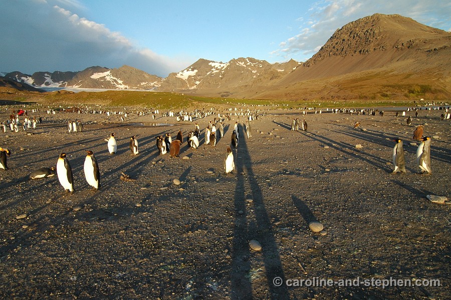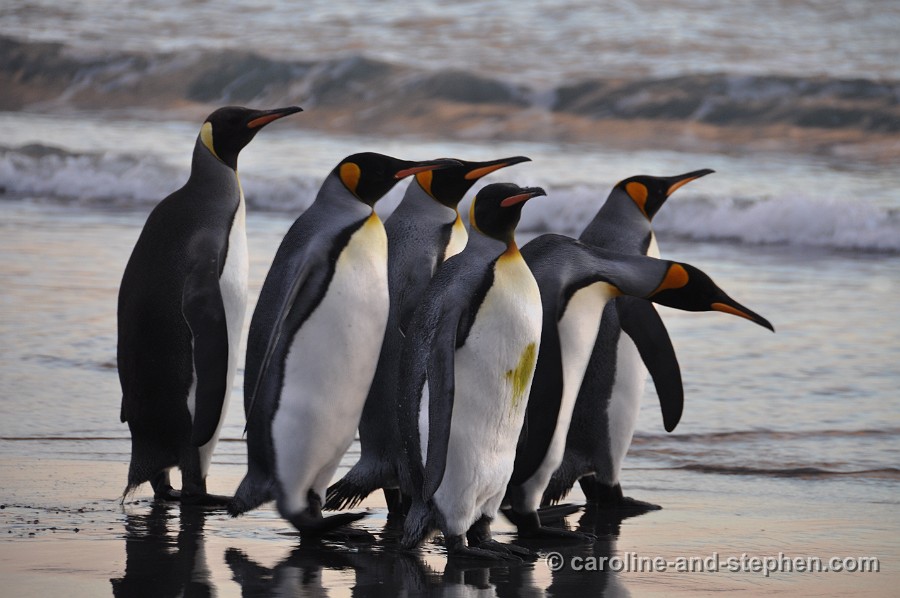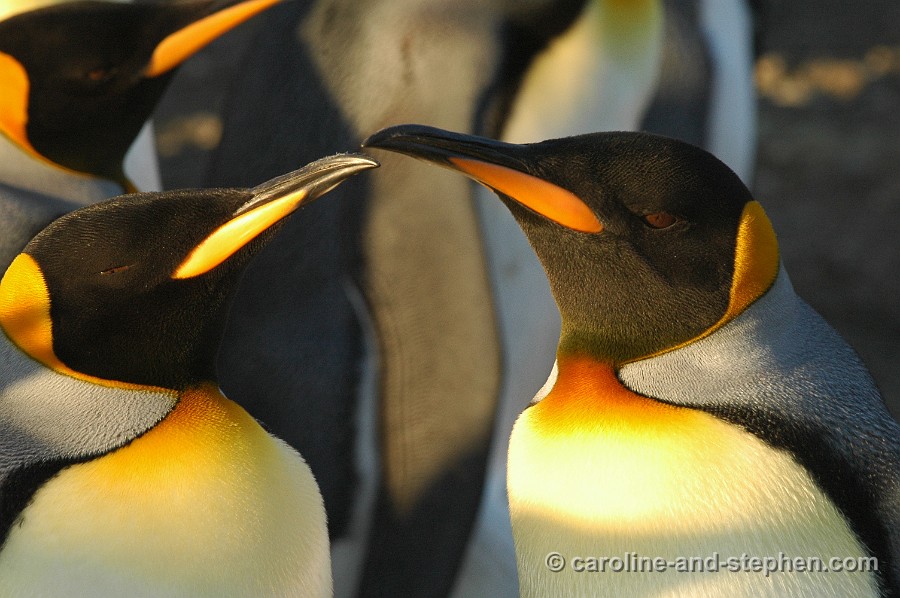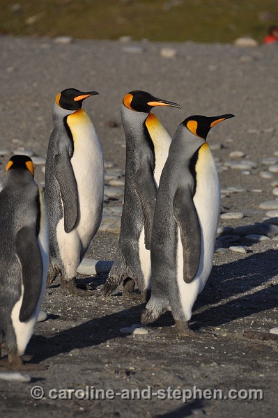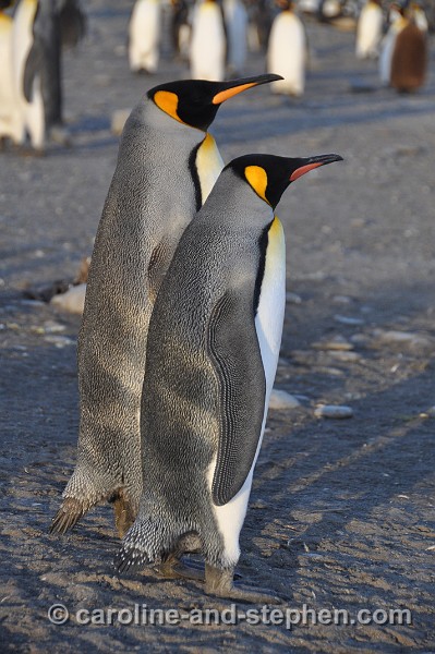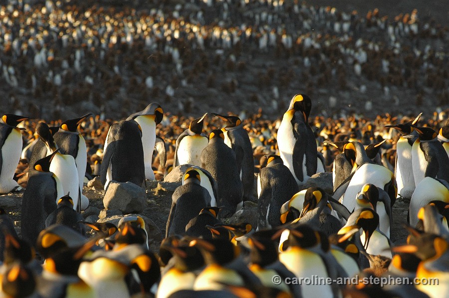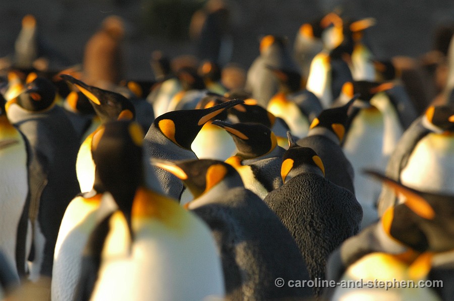 The early sunlight shows the King Penguins in all their glory.