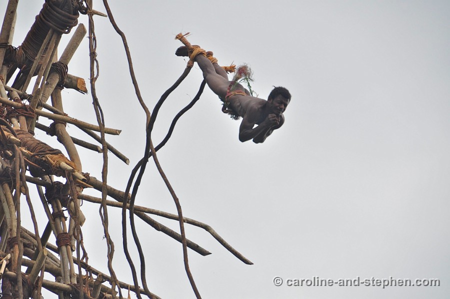 25Pentecost Island. The Tower. Men jump off of wooden towers (made only with natural parts) 20-30 meters / 66 to 98ft high, with 2 tree vines tied around their ankles.
