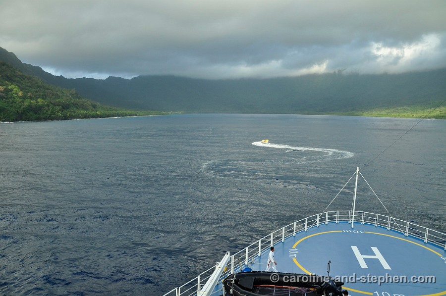 34Ureparapara. Sailing into an extinct strato-volcano, with one side breached by the sea. The pilot boat is doing soundings. The crater is less than 1 mile / 1.6 km across and about 3 miles / 4.8 km long.