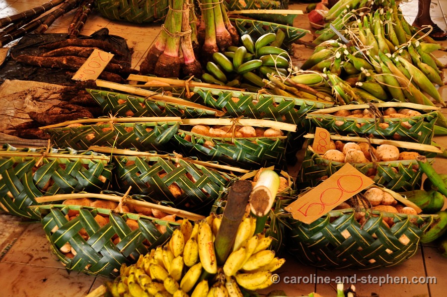 60Port Vila. Fruit and vegetabels wrapped in banana leaves.